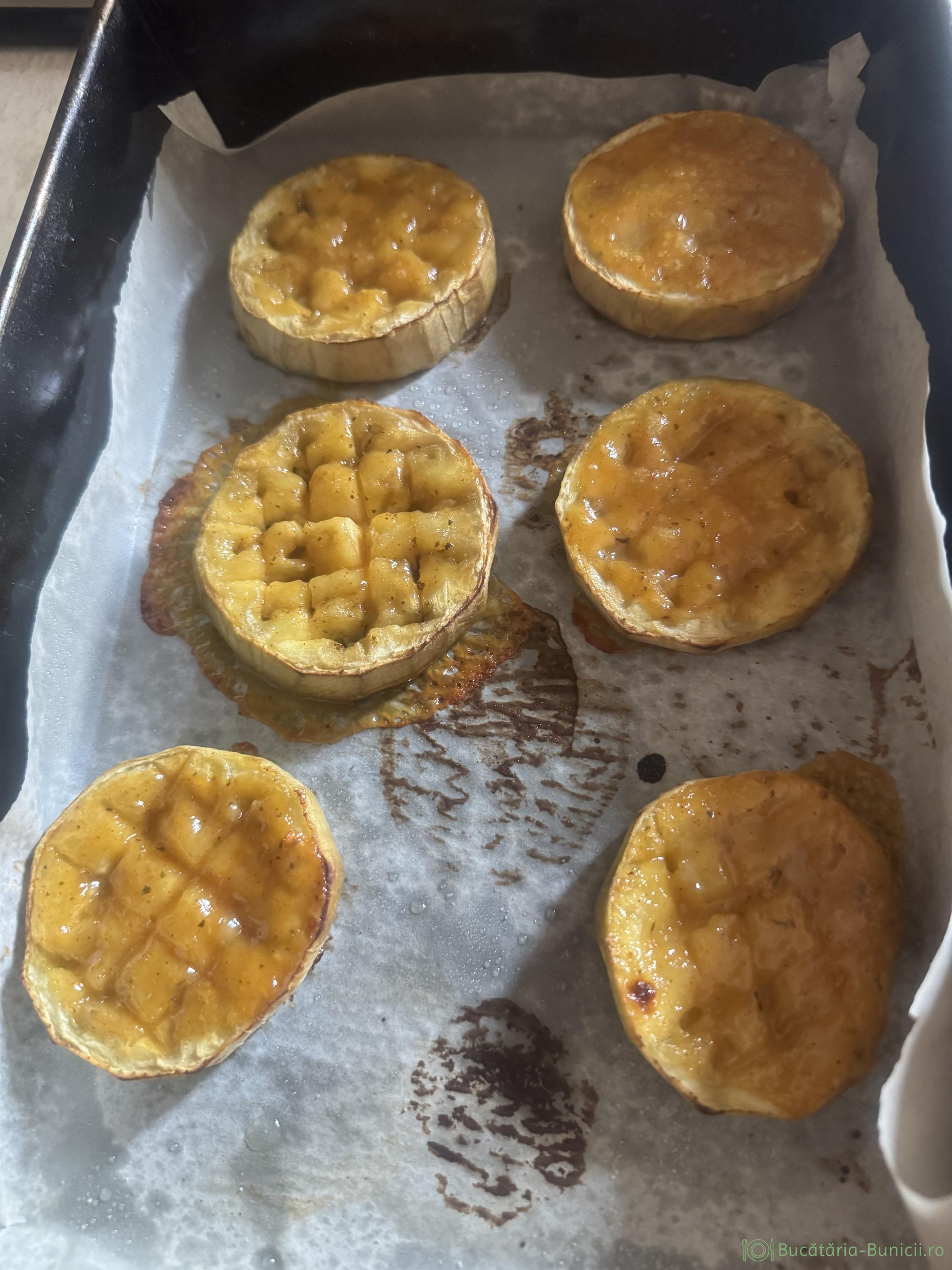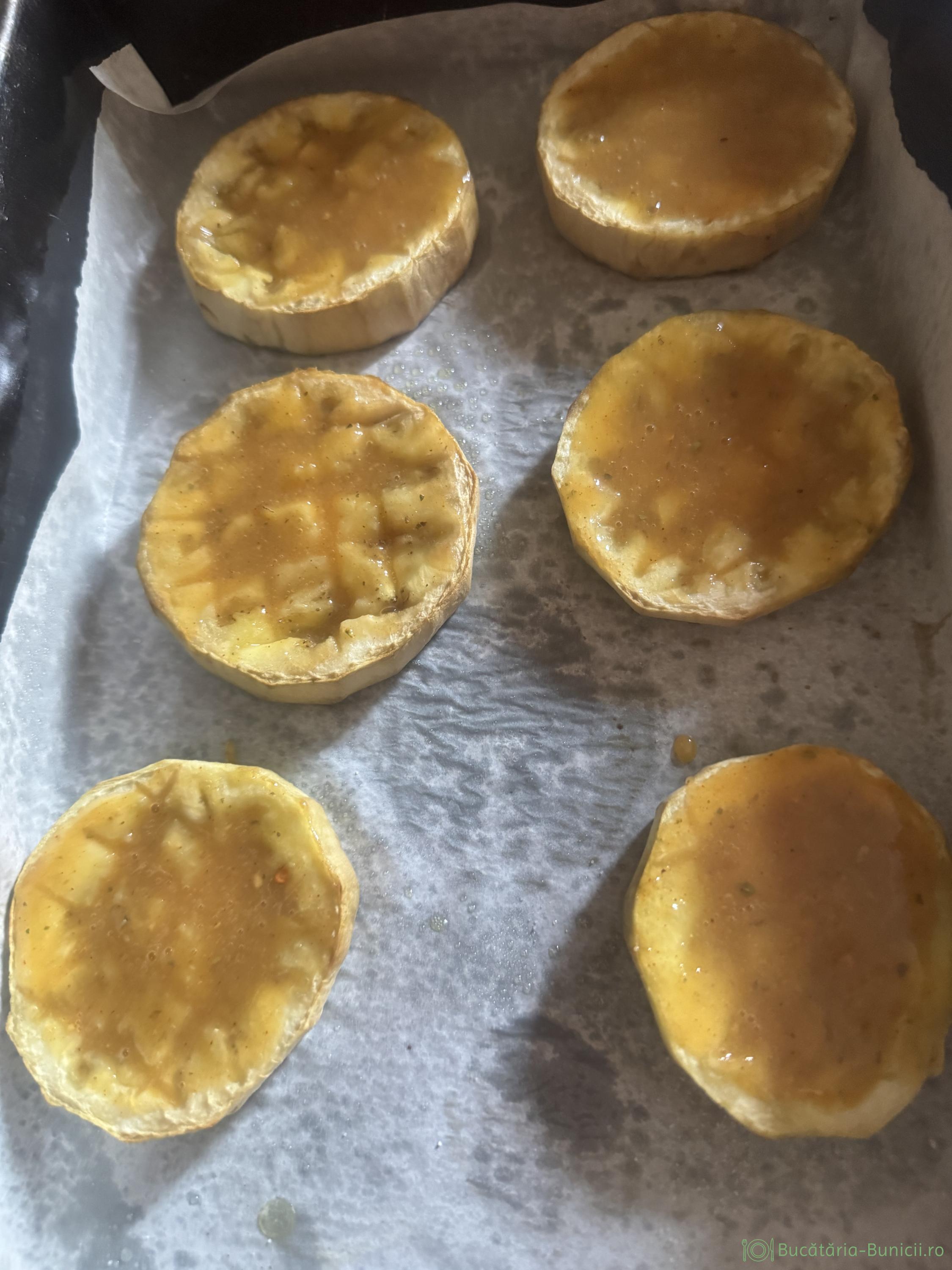 - Se așază feliile de vinete și se țin la cuptor 25-30 minute, la 180 grade, până intră ușor scobitoarea în ele.